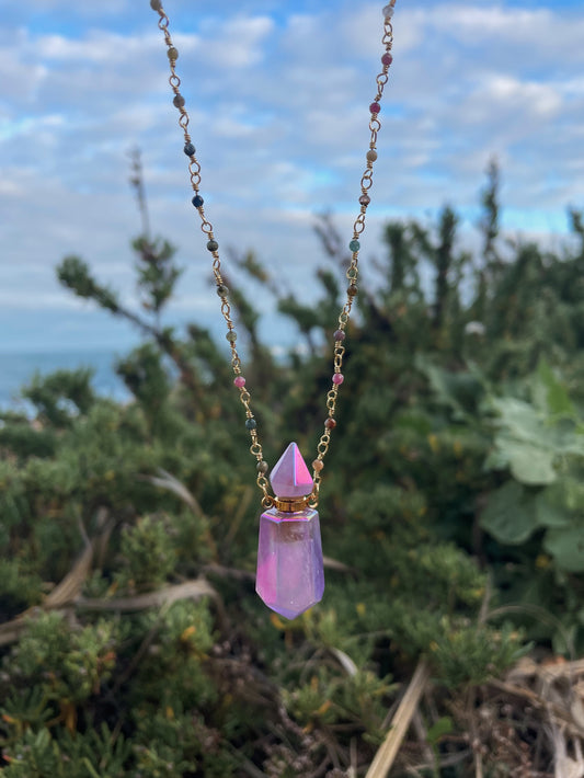 Angel Aura Amethyst Crystal Bottle & Tourmaline Gold Necklace