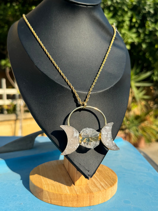 Triple Goddess, Moon Phases, Quartz Druzy, Gold Necklace